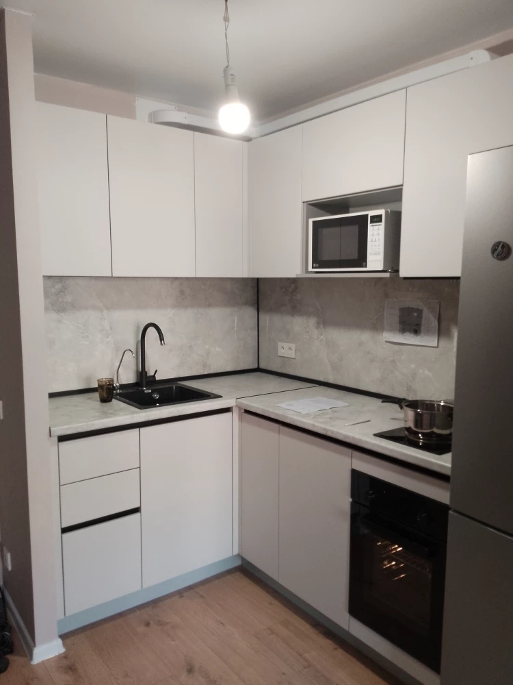 Реализован проект эргономичной угловой кухни для небольшого помещения. Главной особенностью стало использование профиля «Гола» на нижних шкафах, что позволило полностью отказаться от ручек и создать чистый, минималистичный фасад без визуального шума. Спокойные пастельные тона и лаконичные формы визуально расширяют пространство, создавая уютную и функциональную среду.