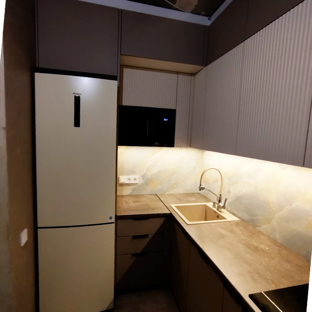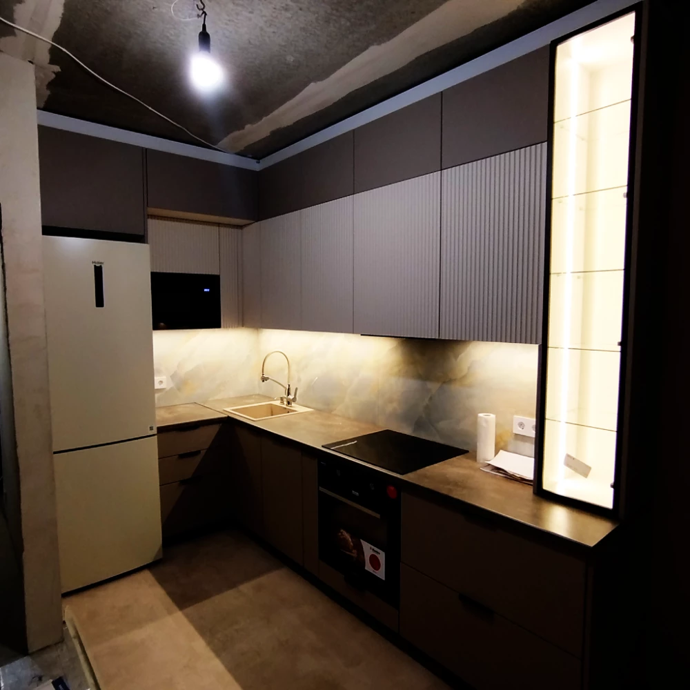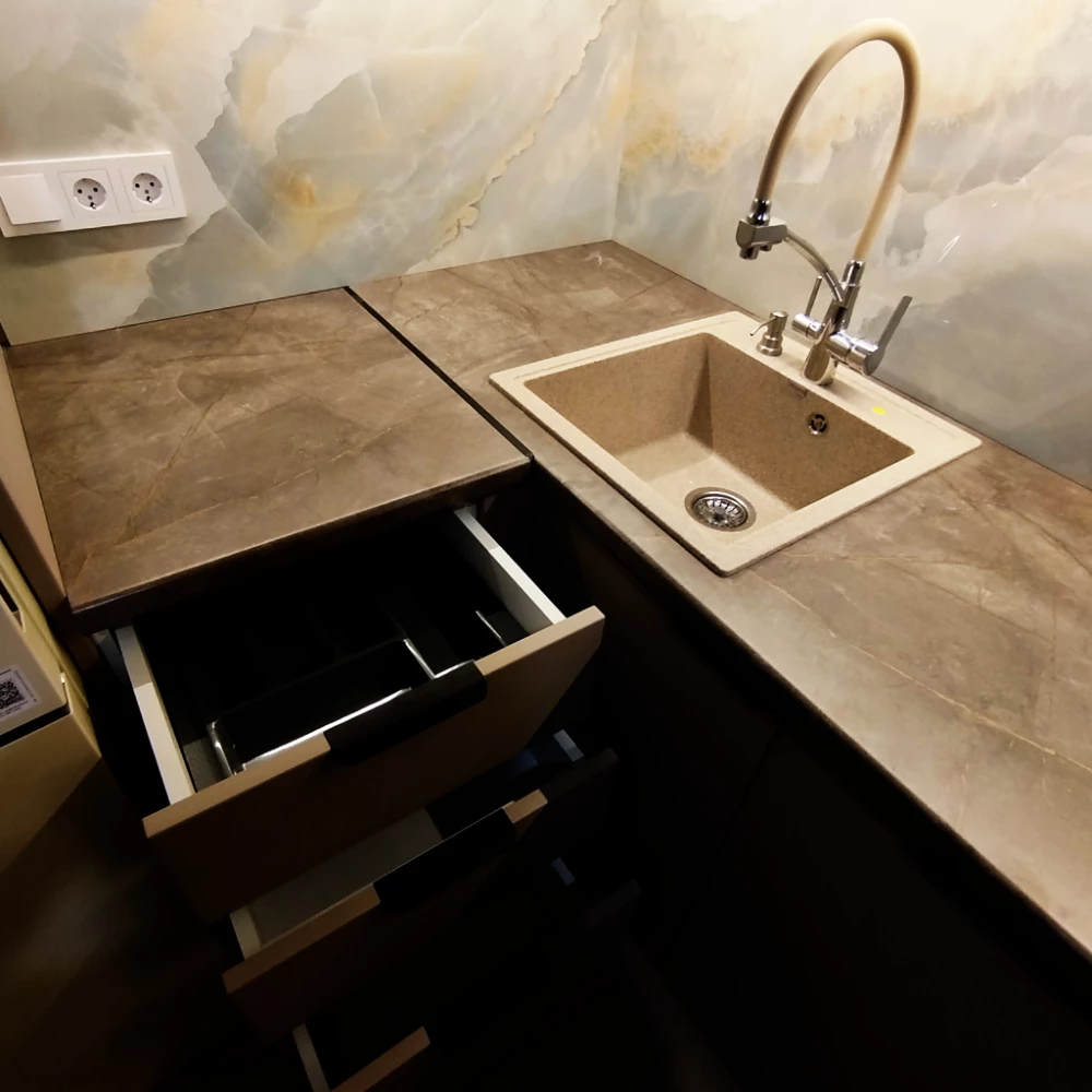- Столешница: Столешница фирмы СКИФ «Бронзовый Каспий 75» — благородный оттенок с выразительной текстурой, подчеркивающий роскошь кухни.