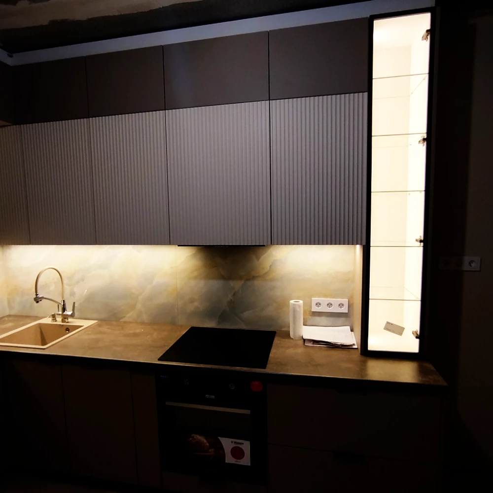 - Богатый дизайн: Сочетание трех уровней, двух видов пленки с разной фактурой (гладкая и 3D), а также контрастного шкафа в алюминиевой раме создает сложный, дизайнерский облик.