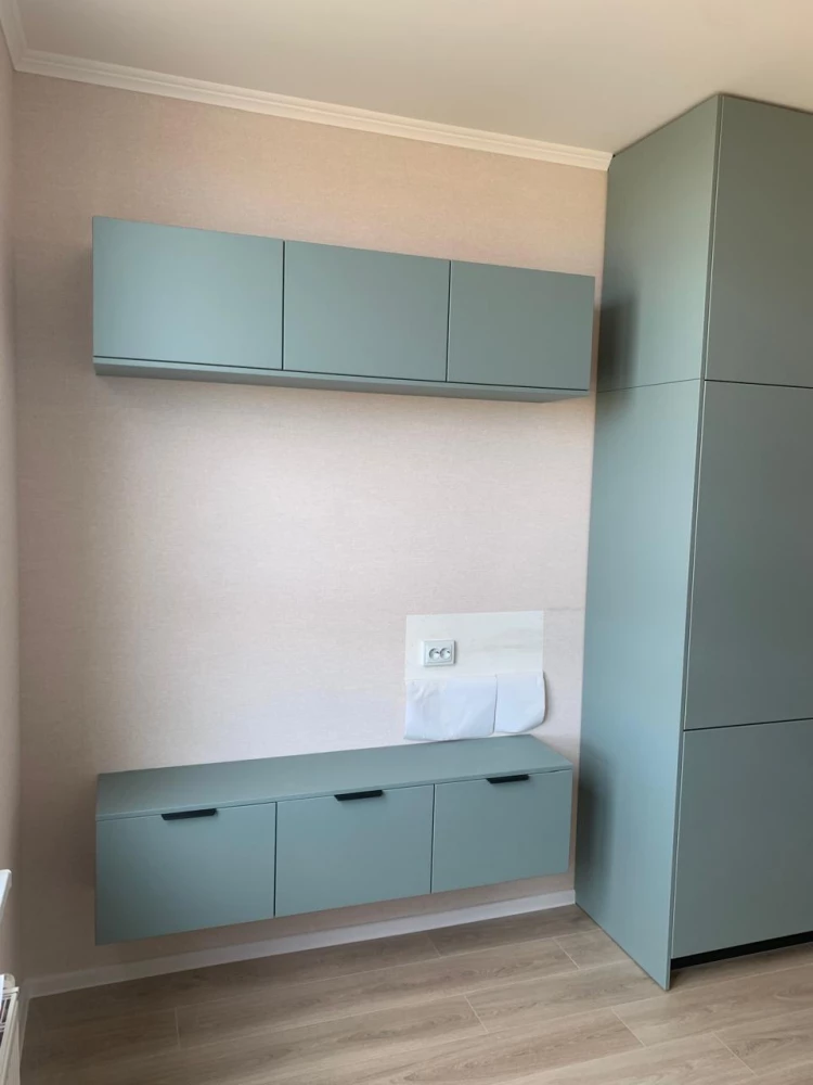 - Зона под ТВ: Для удобства использования на шкафчиках в гостиной зоне установлены лаконичные ручки.