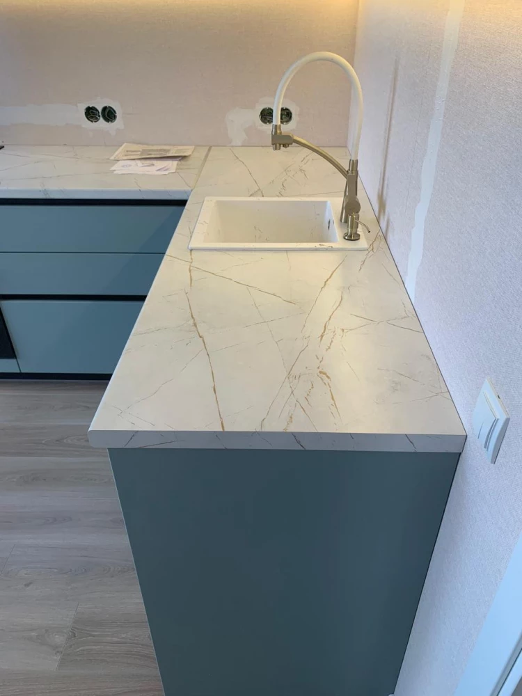 - Столешница: СКИФ «№76 Белый Каспий» — чистая белая поверхность с выразительной текстурой, освежающая интерьер.